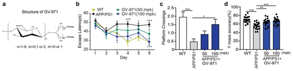 为了验证肠道菌群在AD进展中的重要作用,研究者对APP / PS1小鼠进行GV-971(图3a)治疗三个月。直到13个月大时,GV-971对认知障碍表现出显着的改善作用,这表现为APP / PS1小鼠在莫里斯水迷宫(MWM)任务的训练试验(图3b)和探针试验(图3c)中空间学习能力和记忆能力增强。GV-971还可以显着改善小鼠在Y迷宫中的表现(图3d)。