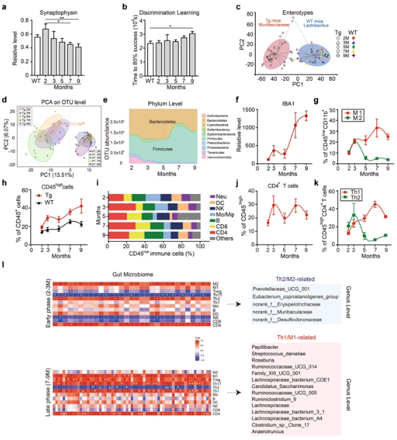 M1和神经保护性M2亚型。初期M1和M2小胶质细胞均增加,随后M1亚型持续增加并在7-9个月达到高峰,而M2型小胶质细胞从3个月下降至5个月并保持此后处于低水平(图1g)。分析AD进展过程中脑中浸润的外周免疫细胞,Tg小鼠的脑中CD45high细胞的频率显着高于WT小鼠,与IBA1染色的结果相似(图1f,h)。进一步分析AD进展过程中一系列时间点的CD45high细胞亚型的变化(图1i)。使用k-均值聚类,发现CD4+T细胞的改变作为CD45high细胞的主要部分,概述了M1细胞的改变(图1i,j)。浸润的Th1和Th2细胞是CD4 +细胞的两个主要亚型,表现出与M1和M2小胶质细胞相似的动力学(图1k)。随着肠道菌群模式的改变,免疫细胞群趋向于转变为Th1和M1为主的状态。