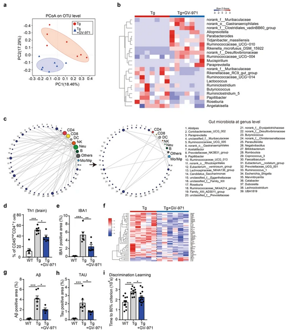 从7个月大开始,在Tg小鼠中每月口服GV-971显着改变了肠道菌群的组成(图4a,b)。与肠道菌群改变相一致,Tg小鼠的GV-971治疗破坏了先前在脑淋巴细胞和肠道细菌变化之间的相关性(图4c),脑Th1细胞减少( 图4d)显着降低了小胶质细胞活化(图4e),并降低了多种脑细胞因子水平(图4f)。同时,GV-971处理显着减少了Tg小鼠的Aβ斑块沉积,tau磷酸化,并减轻了歧视性学习能力的下降(图4g–i)。