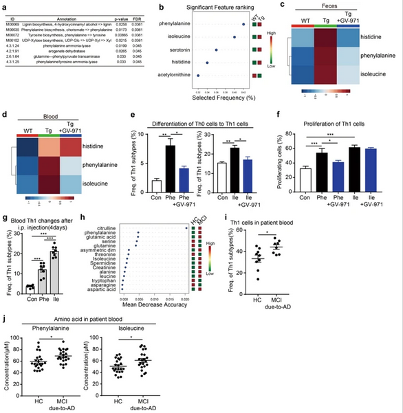 对代谢物进行途径富集分析进一步揭示了氨基酸相关代谢途径和酶的显著变化,特别是苯丙氨酸相关途径(图5a)。使用随机森林算法对这些氨基酸进行分类,将苯丙氨酸在WT和Tg之间是最常见的,然后是异亮氨酸,5-羟色胺,组氨酸和乙酰鸟氨酸(图5b),表明随着疾病的进展它们具有强相关性。然后,在GV-971治疗或未治疗的Tg小鼠中检查了粪便和血液样本中所选氨基酸的浓度,并将其与WT小鼠进行了比较。Tg小鼠粪便中苯丙氨酸和异亮氨酸的浓度显着高于WT小鼠,GV-971处理将其浓度显着降低至与WT小鼠相当的水平(图5c)。血液中苯丙氨酸和异亮氨酸的浓度也发生了类似的变化(图5d)。暴露于苯丙氨酸或异亮氨酸的Th1细胞分化显着增强,这被GV-971处理抑制(图5e)。苯丙氨酸和异亮氨酸显着促进了Th1细胞的增殖,GV-971处理抑制了苯丙氨酸诱导的Th1细胞的增殖,但异亮氨酸的作用几乎没有改变(图5f,蓝色柱)。此外,注射苯丙氨酸和异亮氨酸对野生型小鼠进行治疗,观察到血液中Th1细胞的频率显着增加(图5g)。AD受试者在MCI血液中的苯丙氨酸和异亮氨酸浓度以及Th1细胞频率显着高于健康受试者(图5h,i)。此外,在另一个AD的MCI中也证实了血液中苯丙氨酸和异亮氨酸水平的升高(图5j),表明血液中苯丙氨酸和异亮氨酸的异常蓄积和Th1频率的升高可能是AD患者MCI和健康受试者MCI的特征。