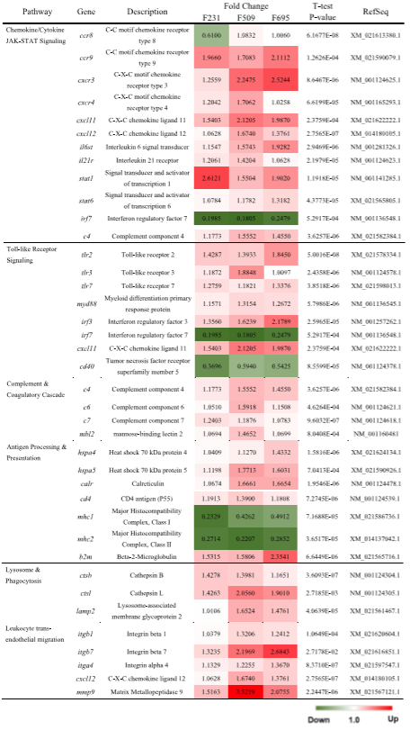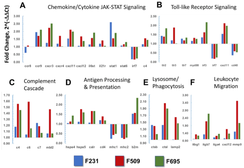 如图1A所示,在所有三个家族中,与导致趋化因子/细胞因子JAK-STAT信号通路的配体-受体结合相关的基因的表达持续上调;这些基因包括ccr9、cxcr3、cxcr4、cxcl11、cxcl12、il6st和il21r(图1A)。虽然stat1的STAT转录因子(STAT1和stat6)和靶基因(c4)的表达增加,但STAT1的另一个靶基因(irf7)显著降低。虽然ccr8的表达在F231鱼类家族中表现出抑制,但是在F509和F695鱼类家族中表现出增加的表达。在Tolllike受体信号通路中,三个不同TLR(TLR 2、tlr3和tlr7)、重要衔接子(myd88)、干扰素调节因子(irf3)及其靶基因(cxcl11)的表达在三个家族中都上调(图1B)。然而,tnfrsf5 (cd40)