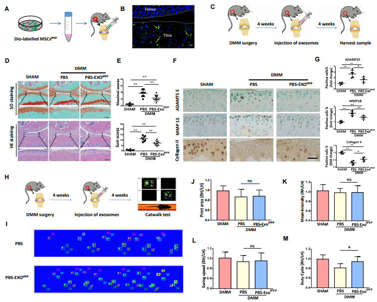 图2.(A)关节内注射方案。(B)代表膝关节中DiO标记的MSCsIPFP -Exos。黄色箭头表示MSCsIPFP -Exos,虚线表示关节表面。(C)关节内注射的设计。(D)Safranin O / Fast Green和H&E染色的膝关节部分。(E)用OARSI评分系统评估软骨破坏。(F)和(G)膝关节胫骨平台切片中胶原蛋白II,ADAMTS5和MMP13的免疫组织化学分析。(H)Catwalk测试的流程图。(I)Catwalk脚印的代表性信号图像。(J-M)组间比较的步态参数的水平变化。