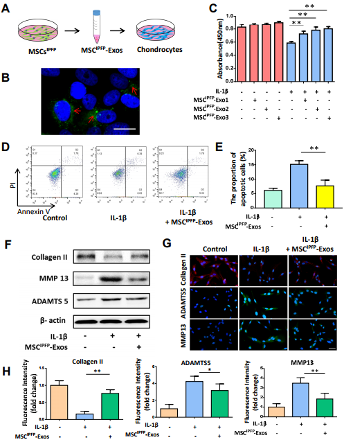 图3. (A)软骨细胞和MSCIPFP11-Exos共培养的模式。(B)由软骨细胞吸收的DiO标记的外泌体的代表性共聚焦显微照片。(C)MSCIPFP -Exos对软骨细胞活力的影响。(D)和(E)通过流式细胞术检测MSCIPFP -Exos对细胞凋亡的影响的结果并统计分析。(F)通过蛋白质印迹测量软骨细胞中胶原蛋白II,MMP13和ADAMTS5的蛋白质表达水平。(G)和(H)通过免疫荧光检测软骨细胞中的胶原蛋白II,ADAMTS5和MMP13表达及统计结果。