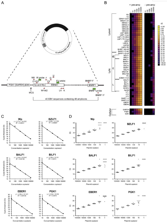 图1.(A)AQ质粒的设计。(B)热图总结了10倍稀释的AQ质粒与对照质粒的45个PCR测定的信号。(C)5份EBV转录本和PGK细胞转录本的典型标准曲线,包括潜伏转录本Wp;立即早期(IE)裂解转录本,BZLF1;早期(E)裂解转录本,BALF1;晚期(L)裂解转录本,BILF1;非编码转录本,EBER1;和细胞转录本,PGK1。(D)10个独立预扩增的AQ-质粒稀释液独立重复的结果证明,Fluidigm Biomark HD系统的结果在4至5个对数范围内是可重复的