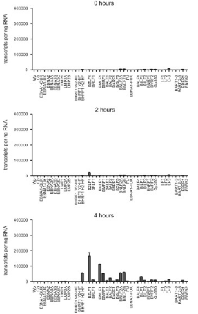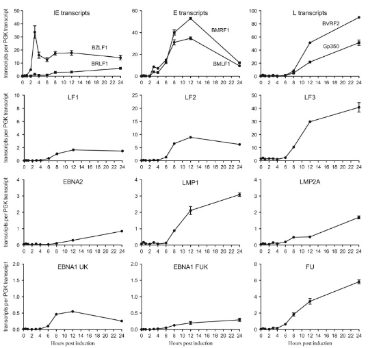 未经处理的Akata-BL细胞(0小时)的潜在基因转录水平非常低。诱导后2小时,BZLF转录本的数量明显增加,尽管第二个IE RNA BRLF1的水平低得多并且在整个时间过程中保持如此。BZLF1是诱导后4小时最丰富的转录本。在此时间点也检测到几种E RNA,其中BHRF1,BMLF1,BMRF1,BNLF2A和BNLF2B是最丰富的。除BNLF2A和BNLF2B外,E基因表达通常持续升高至诱导后12小时,然后下降。相比之下,L基因表达通常在诱导后24小时达到峰值。虽然LF1和LF2的水平在诱导后12小时达到峰值,与E基因表达一致,但LF3仅在24小时达到最大水平。