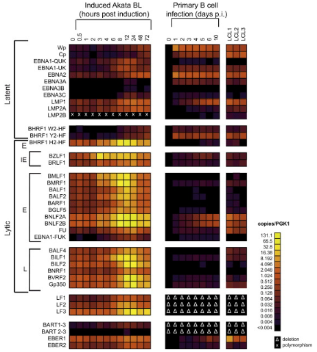 图5.热图比较裂解周期诱导期间和原代B细胞感染期间的EBV转录本水平。数据表示为相对于PGK转录本的EBV转录本的数目。