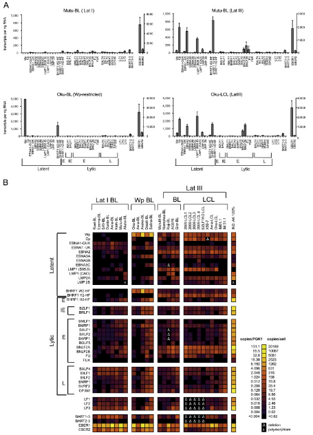 图6.(A)从3条显示不同形式潜伏期的具有代表性的BL线和从Oku BL分离出的EBV株感染正常B细胞所建立的LCL中获得芯片数据。(B)从8个Lat I BL线,5个Wp BL线,5个Lat III BL线和10个LCL获得的数据的热图。