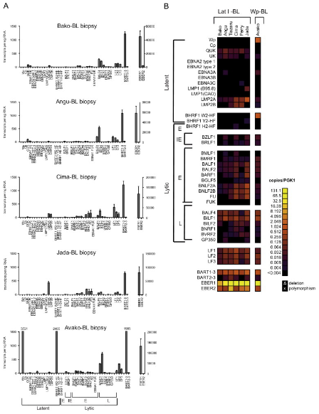 结果总结首先,在感染正常B细胞期间,Wp启动的潜在基因转录物在Cp启动子激活后比目前所怀疑的更加丰富。其次,EBNA1转录水平在所有形式的潜伏期中都非常低,通常为每个细胞1到10个转录物。EBNA3A,-3B和-3C转录物在潜伏期III中同样非常低,通常在与EBNA1转录物相似或更低的水平。第三,裂解基因转录物的子集在Burkitt淋巴瘤细胞系中可检测到低水平,包括:具有致癌特性的BILF1,以及表征不佳的LF1,LF2和LF3基因。对7个非洲BL活组织检查的分析证实了该转录谱,但另外揭示了LMP2转录物的显着表达。
