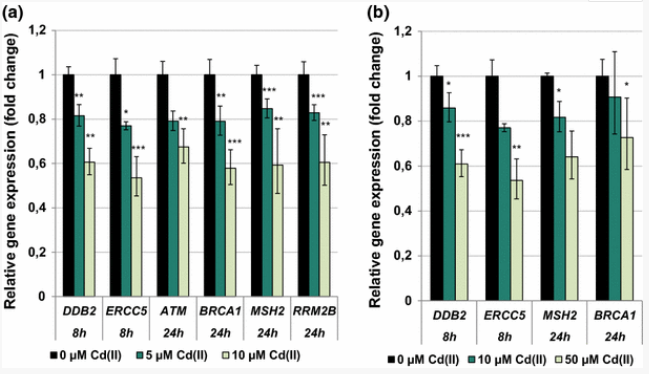 图8.镉对DNA修复系统相关基因表达的影响。 将BEAS-2B细胞(a)或A549细胞(b)用CdCl 2处理8或24小时。