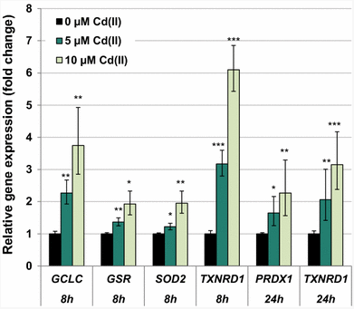 图4镉对抗氧化防御系统相关基因表达的影响。 BEAS-2B细胞用CdCl2处理8或24小时。