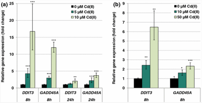 图7.镉对DNA损伤反应相关基因表达的影响。 将BEAS-2B细胞(a)或A549细胞(b)用CdCl 2处理8或24小时。