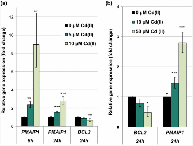 对凋亡相关基因的影响镉通过调节编码内源级联因子的重要基因显示促凋亡信号传导。 在BEAS-2B和A549细胞中,编码促凋亡蛋白NOXA的基因PMAIP1都被诱导转录。 然而,两种细胞系中诱导强度不同。