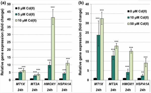 图3镉对与摄取和氧化应激反应相关的基因表达的影响。 将BEAS-2B细胞(a)或A549细胞(b)用CdCl 2处理24小时。