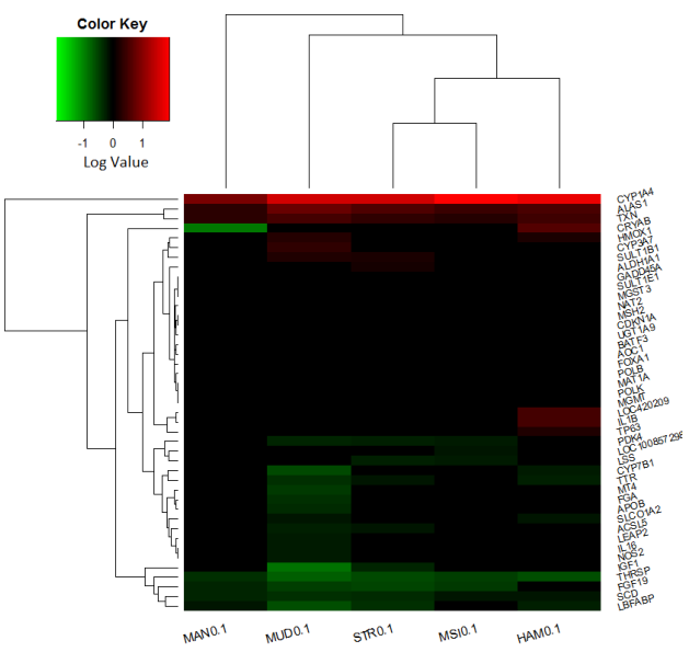 图2显示非大湖地区(MAN)DCCO卵提取物对CEH的影响与其他四组大湖地区的DCCO卵提取物对CEH的影响有明显差异。各组样品中最显著的基因是Cyp1a4。cyp1a4的转录组学评价与erod分析的结果一致,后者测量cyp1a4酶的诱导,并被广泛用作野生动物暴露于与AHR结合的物质的生物标志物。cyp1a4 mRNA诱导的变异性也一致。说明可以使用高通量分析来评估二恶英类(DLC)污染物对不同地点的野生动物的潜在影响。
