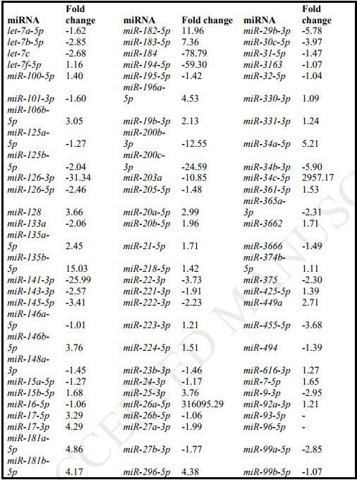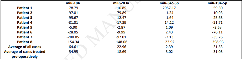 表2. 通过PCR阵列获得患者1中miRNA表达(在肿瘤组织中与相同样品的无肿瘤区域相比)的倍数变化