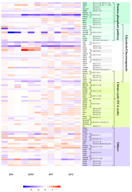 4. BPs处理后的基因表达谱表征糖代谢PCR芯片检测BP处理后基因表达水平的变化:84个选定基因和数据热图如图5所示。糖代谢PCR芯片分析表明,尽管四种BP具有破坏葡萄糖代谢的能力,但它们可能通过不同的机制起作用:BPAF增加了丙酮酸激酶(PKLR)的表达水平,这意味着与NMR结果一致的增强的糖酵解。然而,其他三种BP类似物降低了葡萄糖激酶(GCK)的表达水平,表明葡萄糖感知障碍。