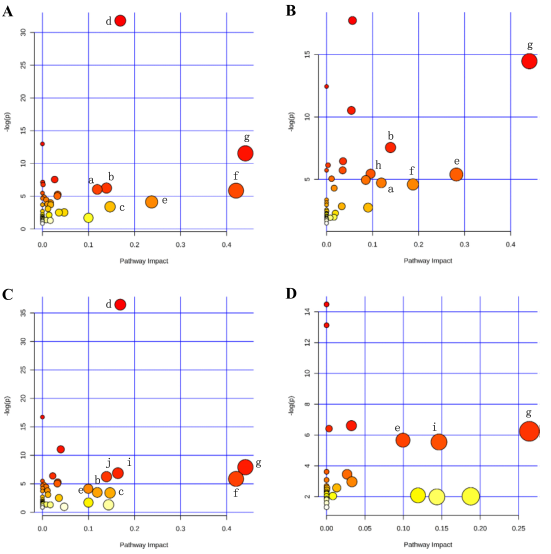 图4. 代谢物组富集分析(MSEA)的总结图(A)溶剂对照与BPA处理; (B)溶剂对照与BPAF处理; (C)溶剂对照与BPF处理; (D)溶剂对照与BPS处理。(a)苯丙氨酸代谢; (b)D-谷氨酰胺和D-谷氨酸代谢;(c)赖氨酸降解;(d)氨基酰基-tRNA生物合成;(e)丙酮酸代谢;(f)甘氨酸,丝氨酸和苏氨酸代谢;(g)丙氨酸,天冬氨酸和谷氨酸代谢;(h)糖酵解或糖异生;(i)甲烷代谢;(j)乙醛酸和二羧酸代谢。
