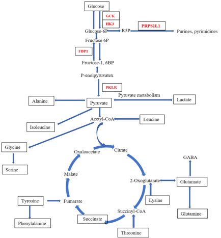 图6.通过1 H NMR分析和PCR阵列,检测到的差异代谢物(黑色)和差异表达基因(红色),并提出被破坏的代谢途径。