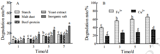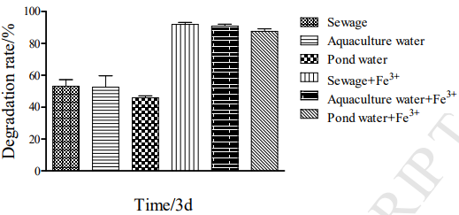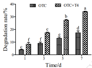 3.天然水基质中T4的OTC降解 如图8所示,前三组在3天内的降解率超过45.0%。后三组的降解率超过88.0%,高于前三组。Fe3 +是影响T4降解OTC的最重要因素。可以加入Fe2O3来控制OTC污染的水环境中的Fe3 +浓度,以增强T4细菌对OTC的降解。