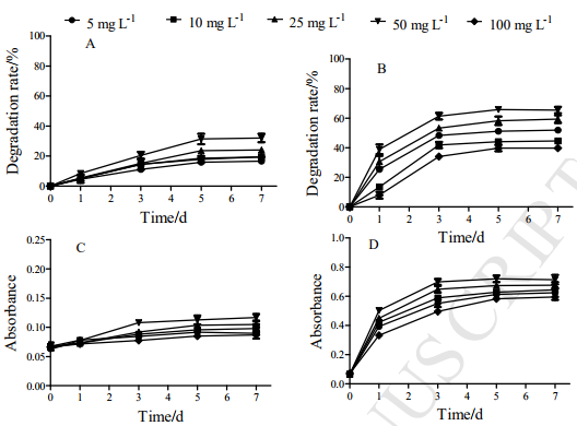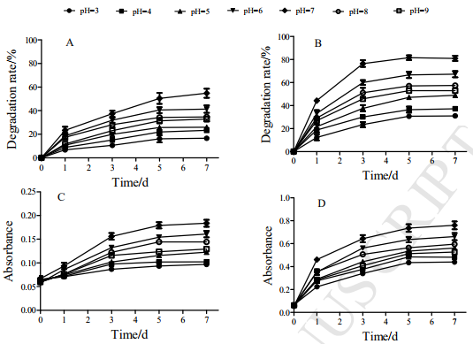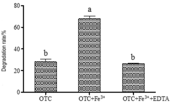 如图6(A)和(B)所示,不同pH值下的降解效率依次为:pH7>6>8>9>5>4>3。 如图7所示,在OTC处理和OTC加Fe3 +处理时,OTC分别下降了28.1%和67.7%。 然而,加入EDTA缓冲液作为萃取剂,OTC降解率降至26.3%。