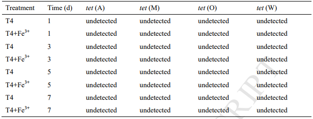生物降解的影响。 2.OTC生物降解过程中ARG的实时监测 本研究未检测到四种常见四环素抗性基因,如tet(m)、tet(a)、tet(o)和tet(w)(表1)。这表明,当使用T4降解OTC时,不能将ARGs引入环境中。这意味着可以开发出一种新的方法来消除环境中ARG的扩散。 表1.