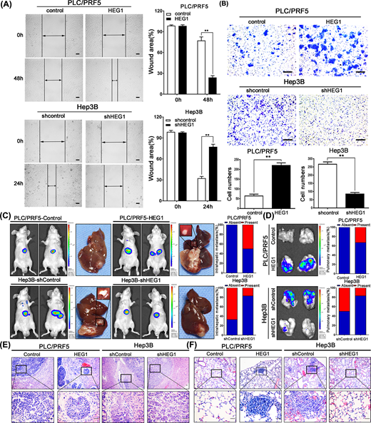 图2. HEG1在体内和体外促进HCC侵袭和转移