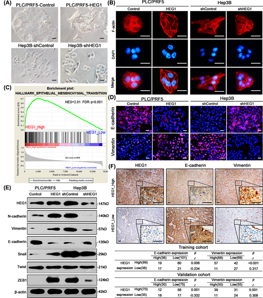 图3. (A)PLC / PRF5-HEG1,Hep3B-shHEG1及其对应的控制单元的代表性相衬图像。 (B)细胞骨架的代表性图像显示HEG1影响细胞形态。(C)来自TCGA数据库的HCC患者中HEG1表达的GSEA。GSEA图表明EMT信号与HEG1表达显着正相关。(D)IF显示HEG1影响EMT标志物的表达。(E)通过蛋白质印迹检测HEG1介导的EMT标志物和相关转录因子的表达水平。(F)肝癌连续切片中HEG1,E-钙黏蛋白和波形蛋白表达的代表性IHC图像。