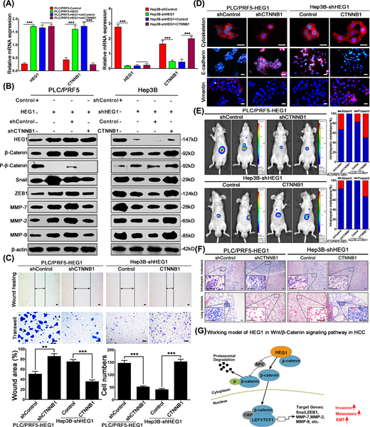图6. 在具有HEG1表达干扰和CTNNB1的敲低或异位表达的HCC细胞中,(A)HEG1和CTNNB1的mRNA表达水平;(B)关键蛋白的表达水平;(C)伤口愈合和transwell测定;(D)细胞骨架和EMT标志物表达测定。(E)显示原位异种移植肿瘤的代表性生物发光图像,以及肝内和肝内肿瘤的比例计算并比较肺转移。(F)原位异种移植肿瘤的肝内和肺转移的代表性H&E染色切片。(G)HEG1介导的通过β-catenin和APC激活Wnt信号传导并促进HCC侵袭,转移和EMT的工作模型。