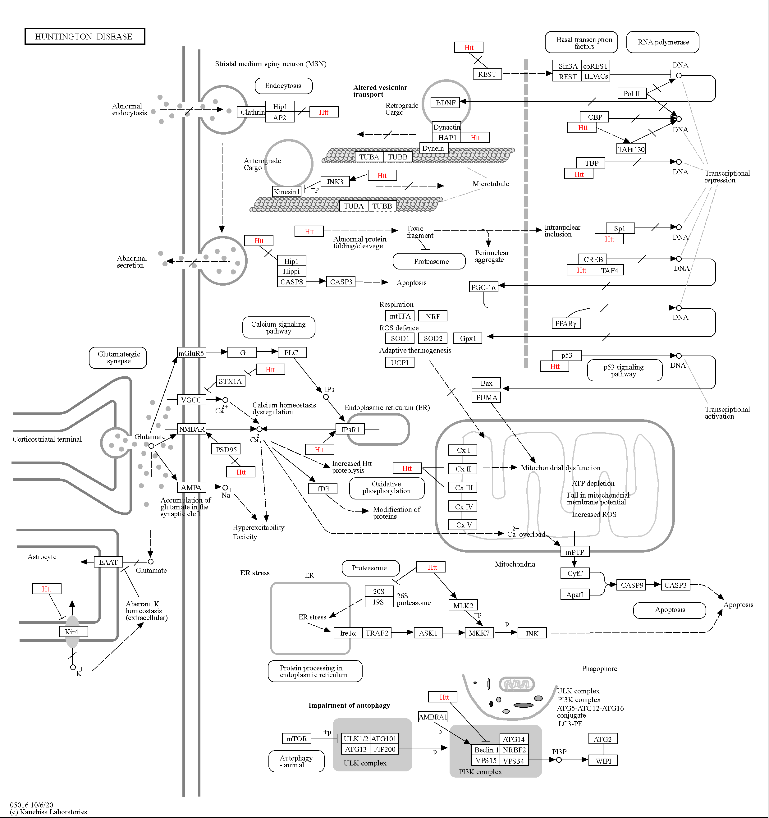 亨廷顿疾病(HD)是一种常染色体显性遗传性神经退行性疾病,主要影响中棘纹状体神经元(MSN)。症状为舞蹈样,不自主运动,性格改变和痴呆。HD是由IT15基因中的CAG重复扩增引起的,其导致靠近HD蛋白亨廷顿蛋白(Htt)的氨基末端的长链聚谷氨酰胺(polyQ)。突变体Htt(mHtt)在细胞质和细胞核中都有作用。全长亨廷顿蛋白被细胞质中的蛋白酶切割,导致细胞质和神经炎聚集体的形成。mHtt还改变囊泡运输和再循环,引起细胞溶质和线粒体Ca2+超载,通过蛋白酶体功能障碍触发内质网应激,并损害自噬功能,增加神经元死亡易感性。含有polyQ-strech的N-末端片段易位至细胞核,在那里它们损害转录并诱导神经元死亡。